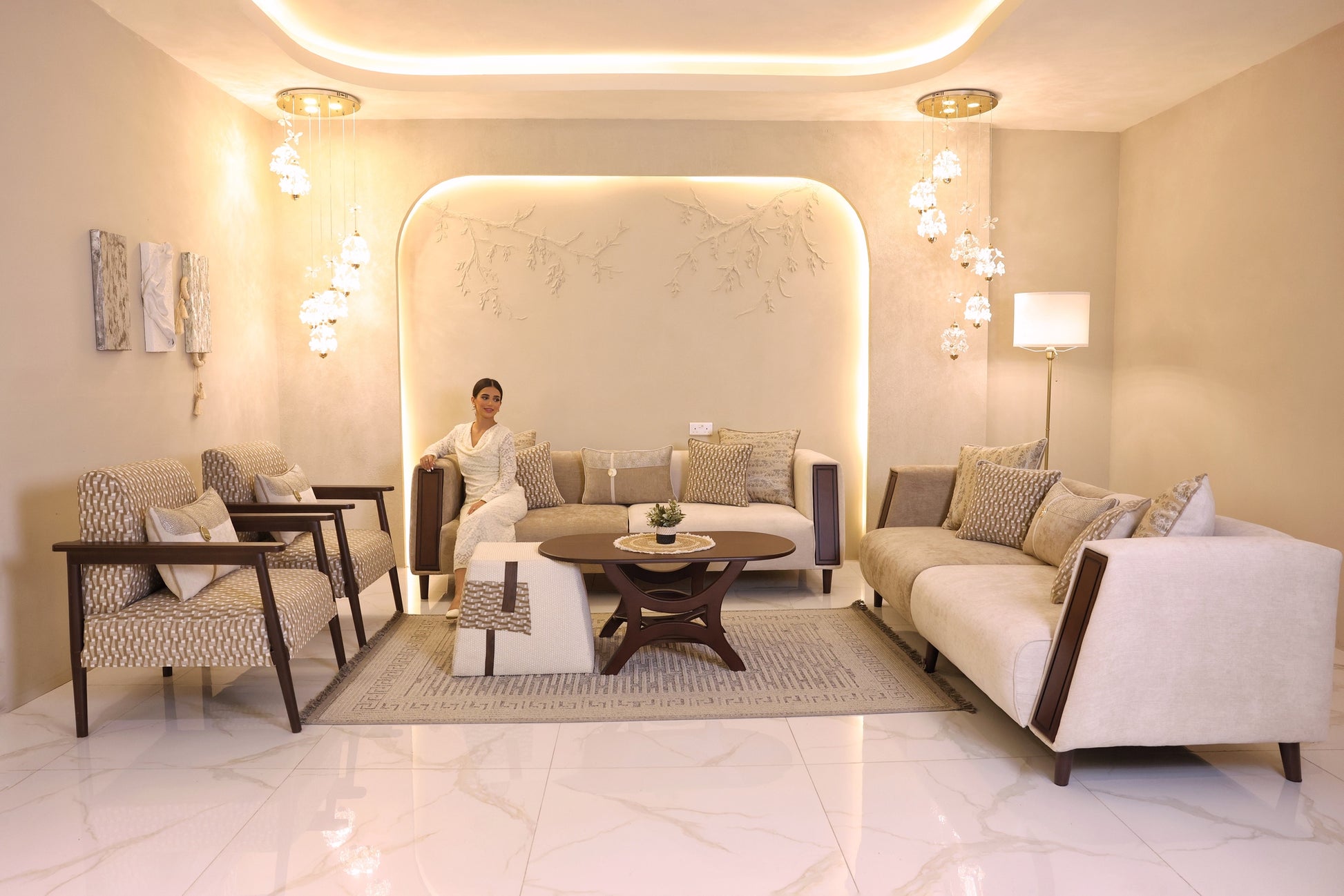 تصميم خالد: اللون العاجي والوسائد المتناسقة يمنحان مظهرًا أنيقًا ومرنًا يتناسب مع مختلف أنماط الديكور