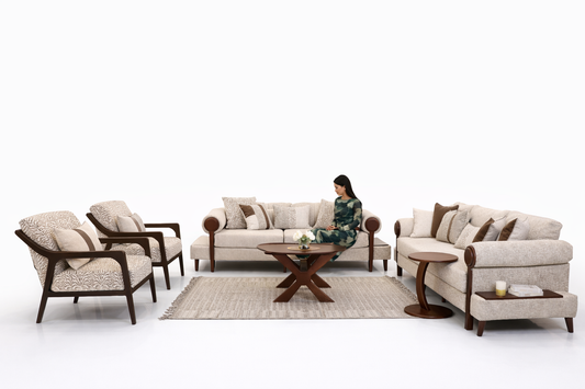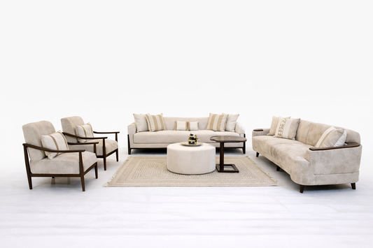 اجمع بين الأناقة العصرية والراحة الفائقة مع طقم الكنب وودي، والمصمم ليرتقي بجمال وأناقة مجلسك....