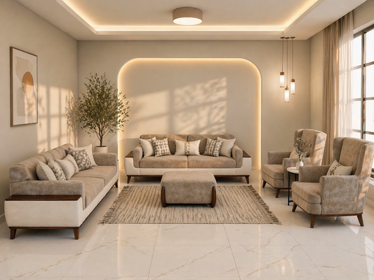 طقم الكنب بلونه البيج الفاتح والبني يُضفي دفئًا وأناقة على أي مساحة معيشة. فقد تم...