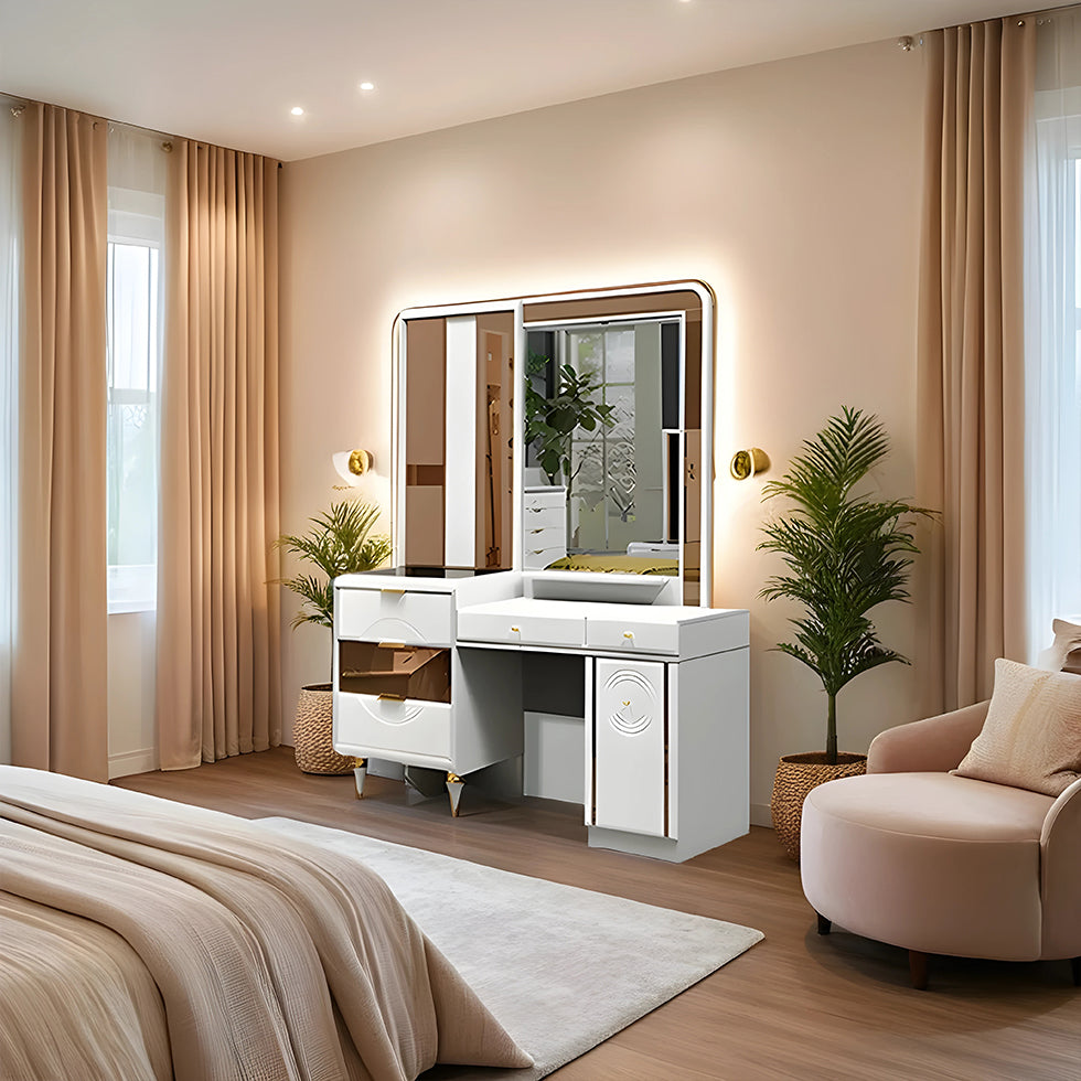 - Elegant Dresser with LED Touch Sensor Light : Includes a large mirror framed with soft LED lighting, activated with a gentle touch. Comes with a matching chair for added comfort during grooming routines.