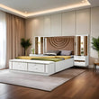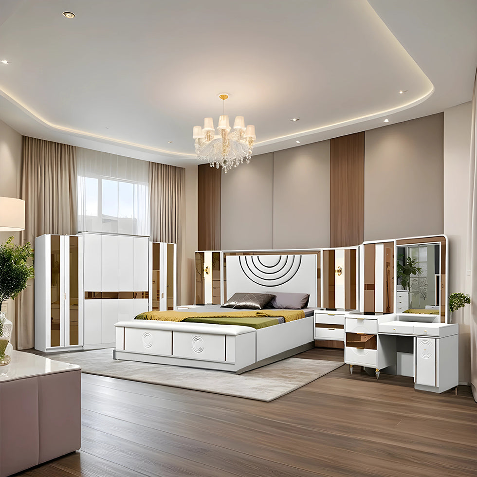The Armada Bedroom Set exudes modern elegance with its pristine white color beautifully accented by a luxurious golden finish. Designed to elevate contemporary interiors, this set blends clean lines with rich detailing for a sophisticated appeal. The combination of sleek surfaces and golden accents offers a timeless charm, making it a stunning focal point in any bedroom. With its refined craftsmanship and modern flair, the Armada Bedroom Set brings both comfort and style to your personal space.