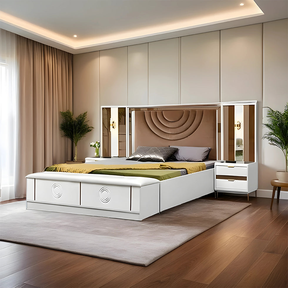 راحة متكاملة بتصميم متناغم: طقم متكامل يجمع بين كل عناصر غرفة النوم الأساسية في تصميم واحد أنيق وعملي، مثالي لمن يبحثون عن الجمال والوظيفة معًا
